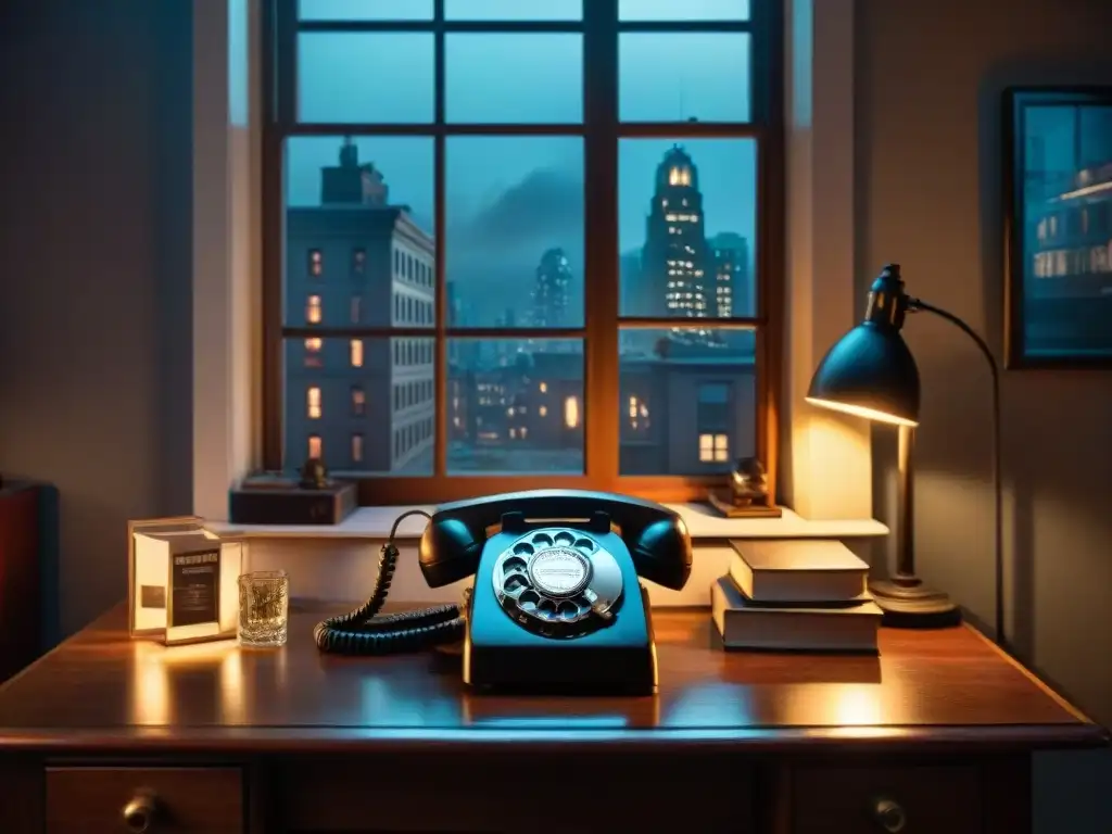 Escena de espionaje en 'The Night Manager' con escritorio de madera, teléfono vintage y figura misteriosa