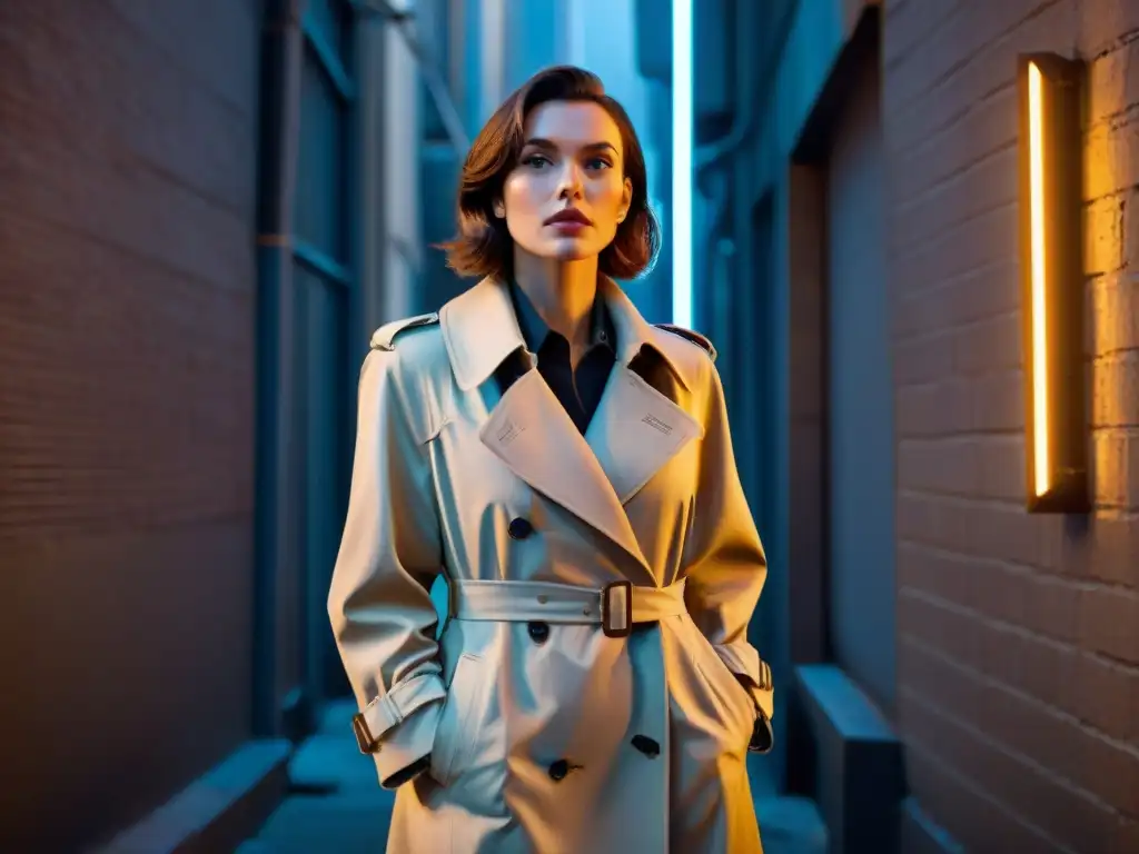 Una detective misteriosa examina pistas en un callejón oscuro, evocando el cine noir